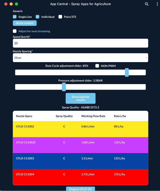 Our Fantastic Nozzle range of Apps and calculators work a different way to the ASJ's and Agrifac's. With PWM and PWFM systems, we ask you to input only speed and nozzle spacing. Then using default pressure and duty cycles which we customise to your specific sprayer, we display a list of nozzles of various sizes and their rates per hectare. We also show Spray Quality and if the displayed nozzle does not suit, there are various other nozzles you can select from of differing Spray Qualities below the results.