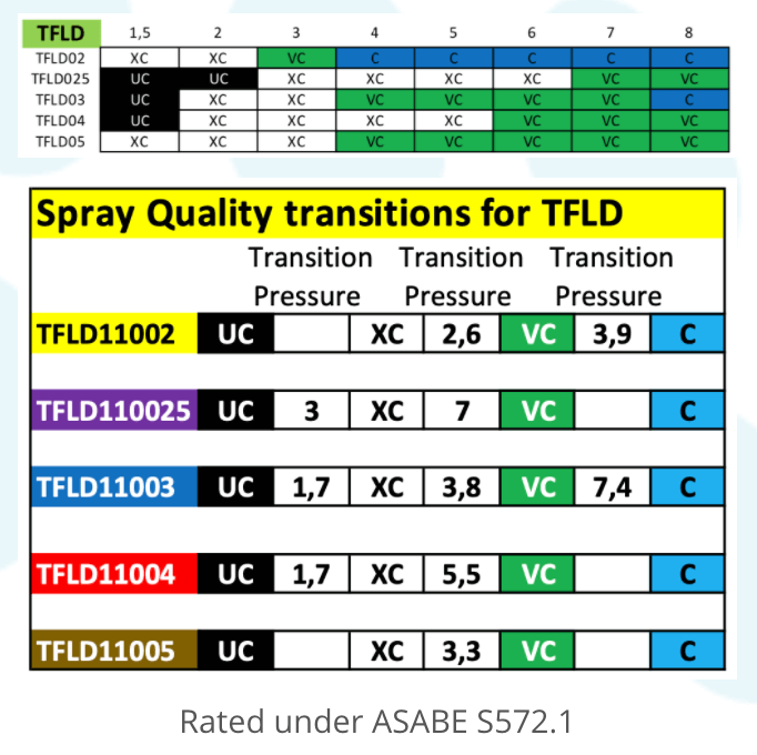 At nozzles.online we offer more detailed transition pressures than the usual chart which look like this. Here is what the basic and our more detailed Spray Quality transition charts look like, for our standard PWM 2,4-D nozzle, the Twin Fan Low Drift: